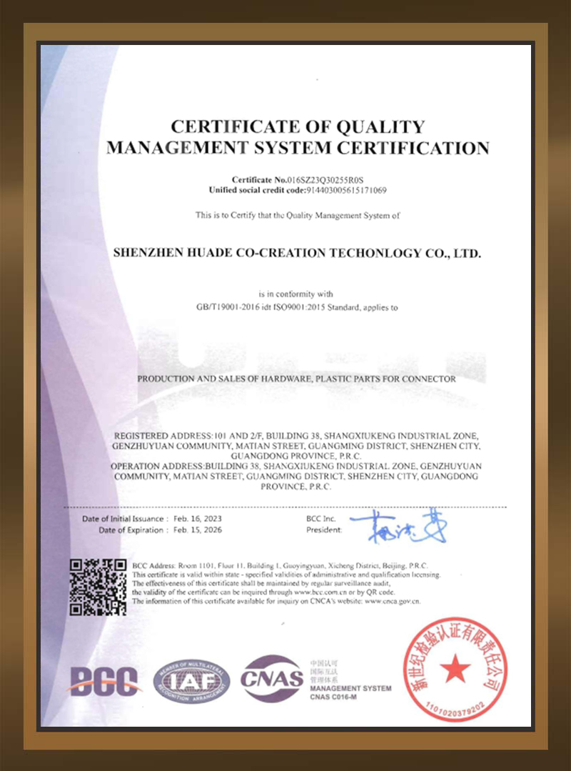 深圳市華德共創科技有限公司初創于2008年,公司坐落在中國經濟最發達的城市之一的廣東省深圳市。華德共創連接器是一家模具開發、生產、銷售一體化的專業電子連接器廠家。公司已通過ISO9001質量管理體系認證,ISO14001環境管理體系認證,UL安規認證,國家高新技術企業認定 ,國家專精特新企業認定 , 并獲得多項產品專利。產品符合如RoHS、REACH、無鹵類等環保要求。 華德共創連接器在海內外日益提升的品牌形象和業績離不開品質第一、信譽第一、客戶滿意的質量方針,華德共創連接器將持續秉承為企業持續成長而拼搏、為員工提供健康的工作環境的企業理念。根據客戶需求的變化,努力創新,用品質和服務撐起與客戶和諧發展的廣闊空間,最終成為可信賴的連接器解決方